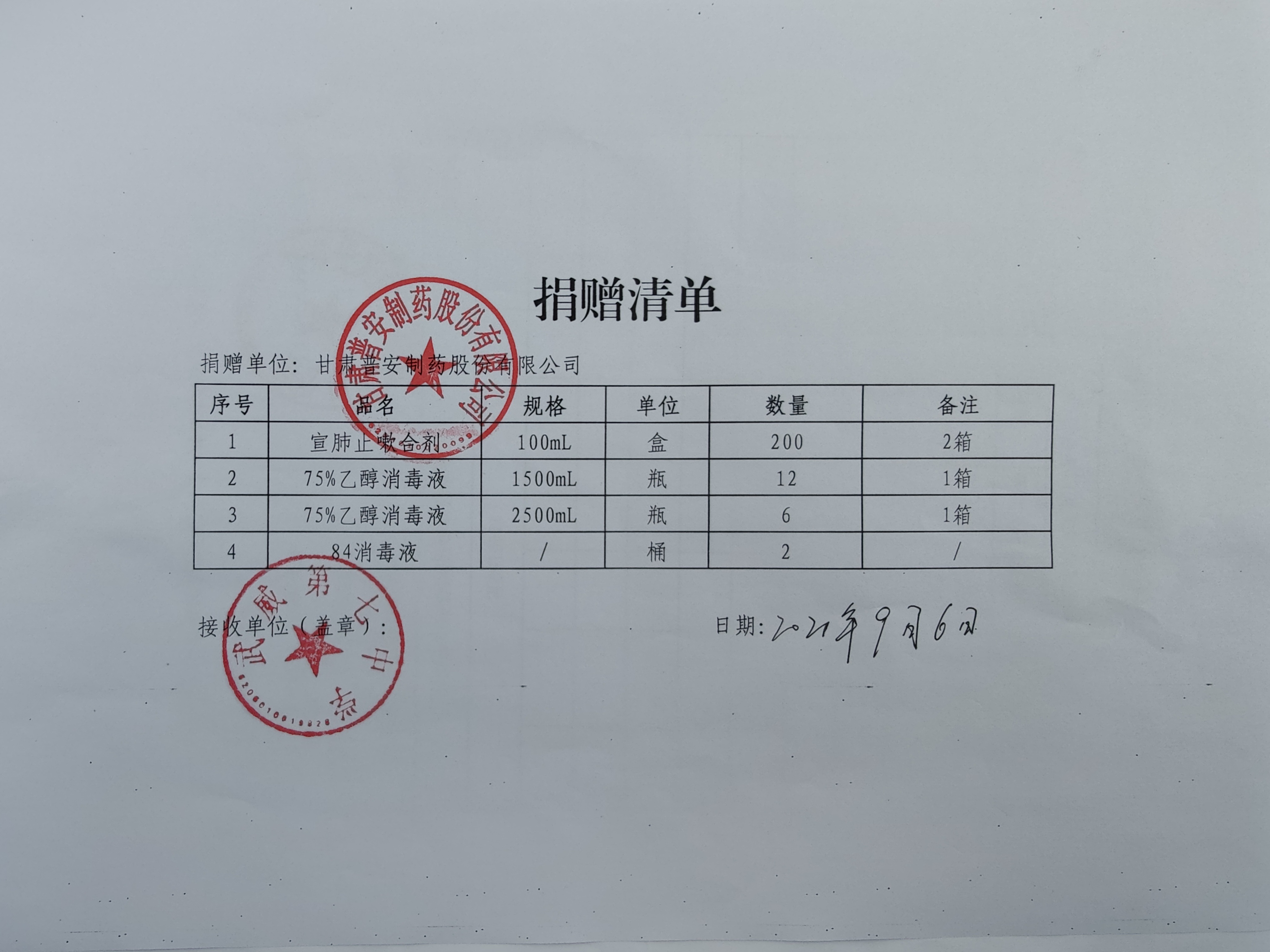 金秋九月,涼風(fēng)送爽,又是一年開學(xué)季。為進(jìn)一步助力疫情防控工作有效開展,弘揚“普惠眾生、安康萬家”的企業(yè)理念,近日甘肅藥業(yè)集團(tuán)普安制藥(以下簡稱:普安制藥)向甘肅畜牧工程職業(yè)學(xué)院、武威第七中學(xué)捐贈宣肺止嗽合劑、乙醇消毒液、84消毒液等防疫物資,向涼州區(qū)黃羊?qū)嶒炐W(xué)捐贈了20套愛心體育包(含籃球、足球、排球、羽毛球、乒乓球等)和一批防疫物資(宣肺止嗽合劑、乙醇消毒液和84消毒液),用實際行動支援疫情防控,助力開學(xué)季。