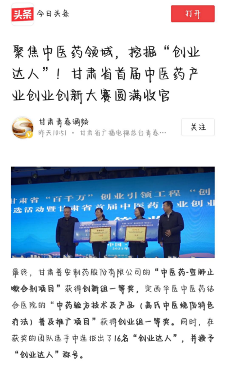 此次大賽也受到了媒體朋友的高度關注,相繼由人民網、中新網、今日頭條、試聽甘肅、新甘肅、甘肅青春調頻等多家媒體相繼報道了甘肅普安制藥股份有限公司在此次大賽中獲得創新組一等獎及“創業達人”稱號的事宜。