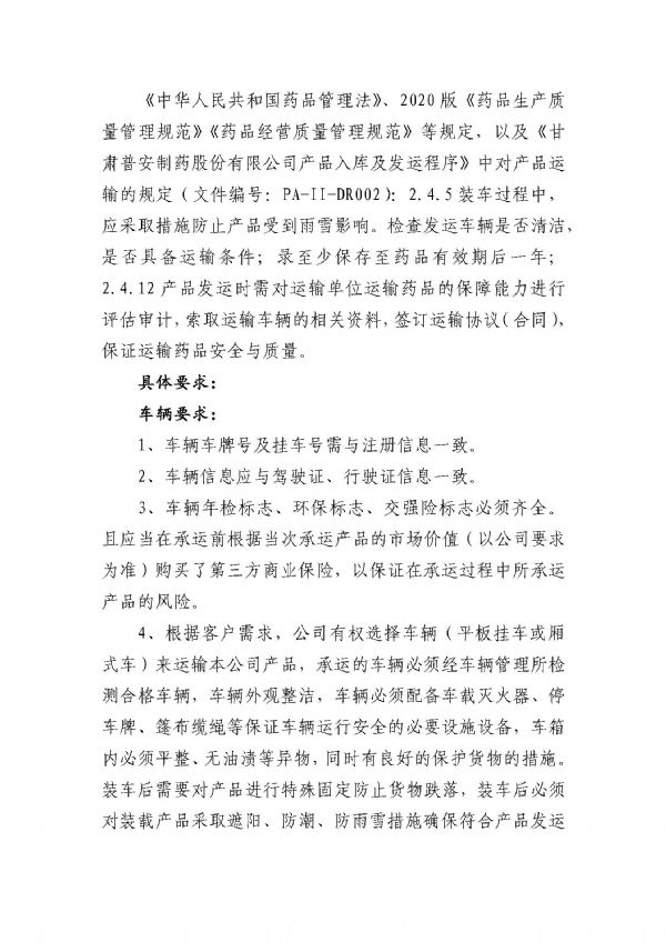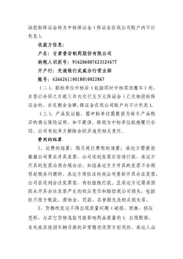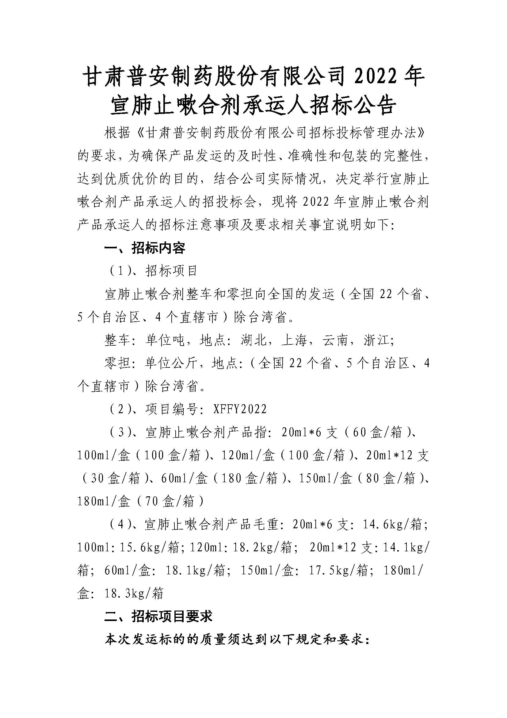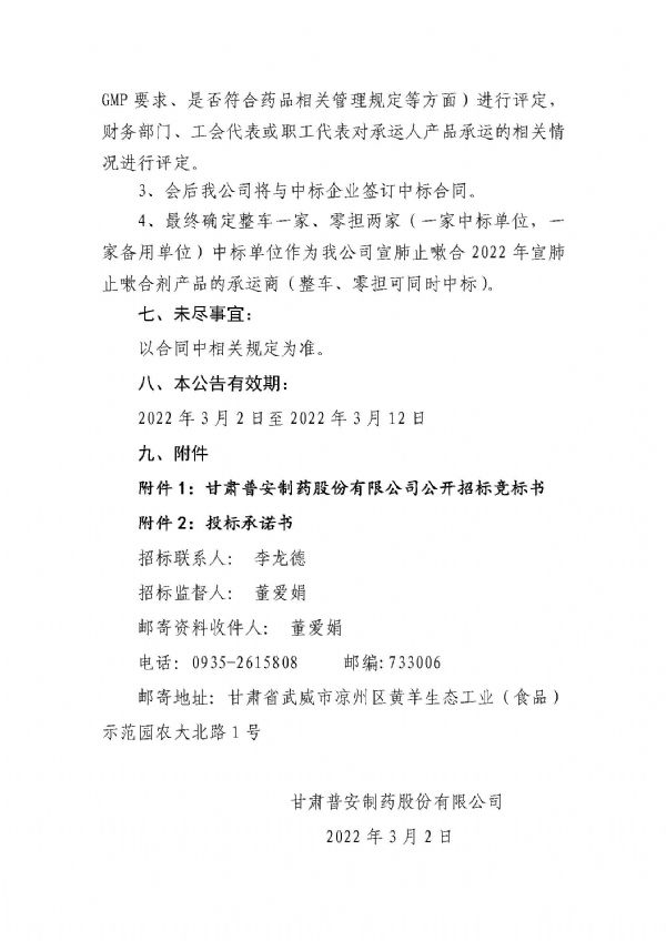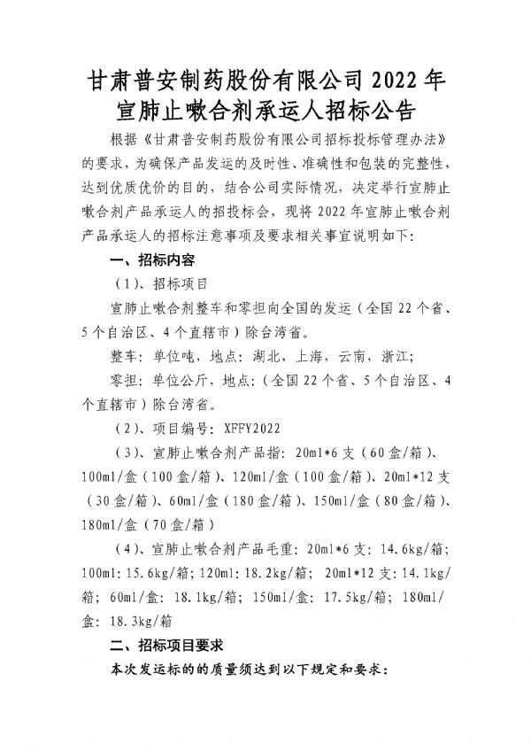 甘肅普安制藥股份有限公司宣肺止嗽合劑2022年承運人招標公告