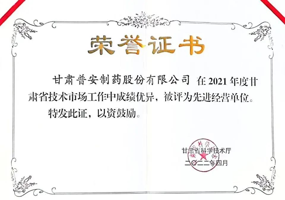 日前,甘肅省科學技術廳通報了2021年度甘肅省技術市場先進經營單位,集團公司所屬企業甘肅普安制藥股份有限公司(以下簡稱“普安制藥”)榮獲2021年度全省技術市場工作先進經營單位。
