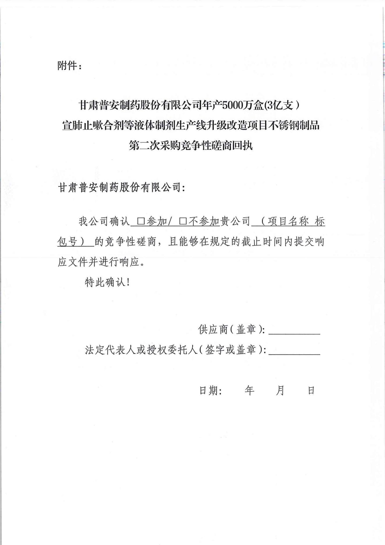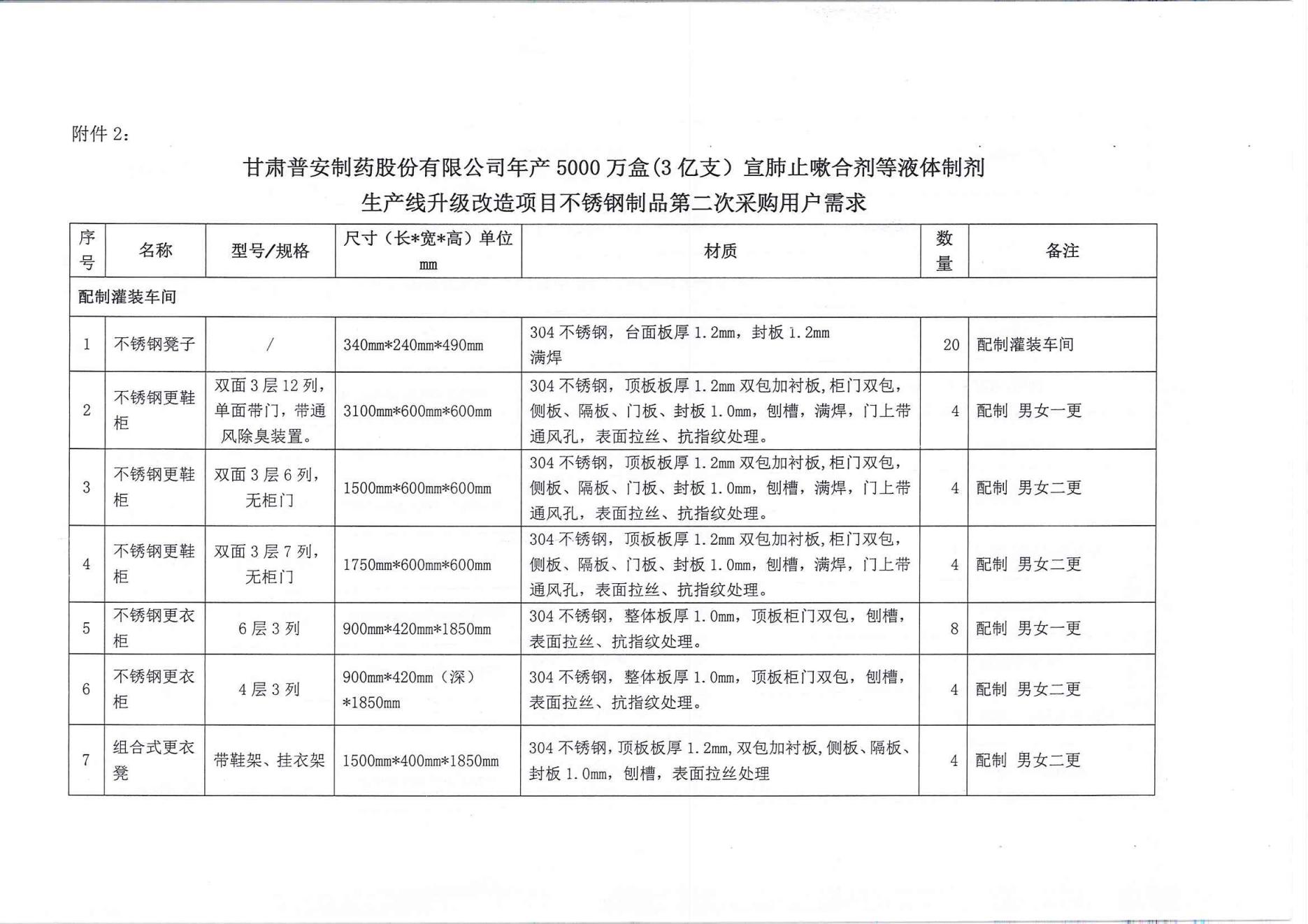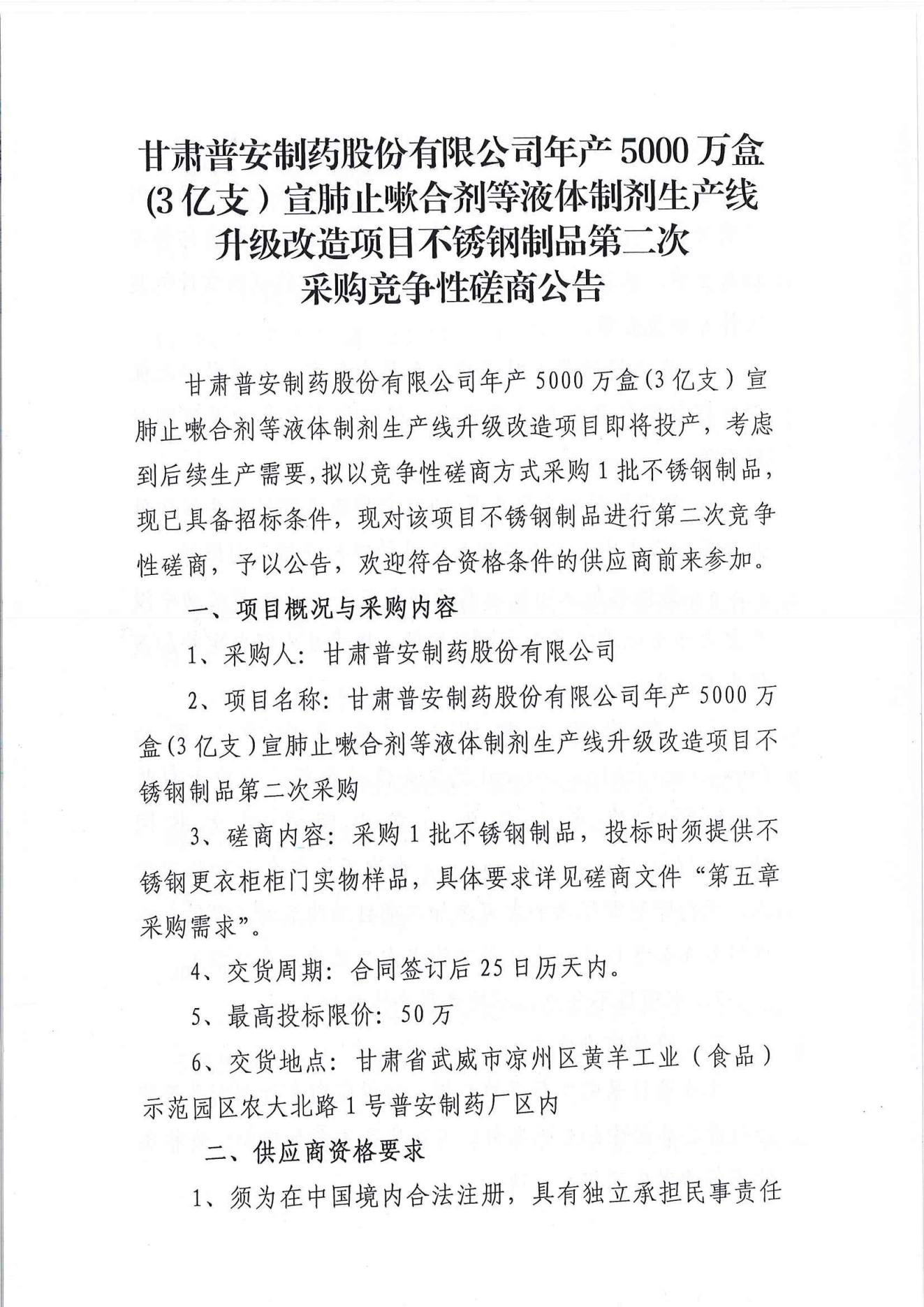甘肅普安制藥股份有限公司年產(chǎn)5000萬盒(3億支)宣肺止嗽合劑等液體制劑生產(chǎn)線升級改造項目不銹鋼制品第二次采購競爭性磋商公告