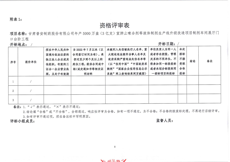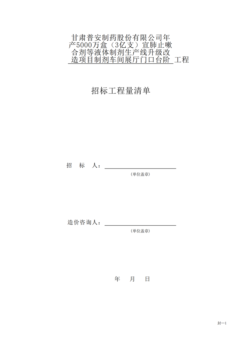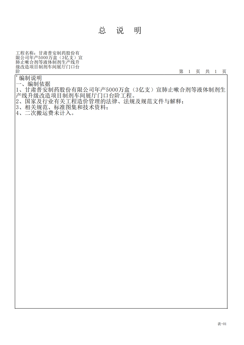 甘肅普安制藥股份有限公司年產(chǎn)5000萬(wàn)盒(3億支)宣肺止嗽合劑等液體制劑生產(chǎn)線升級(jí)改造項(xiàng)目制劑車間展廳門口臺(tái)階工程招標(biāo)公告