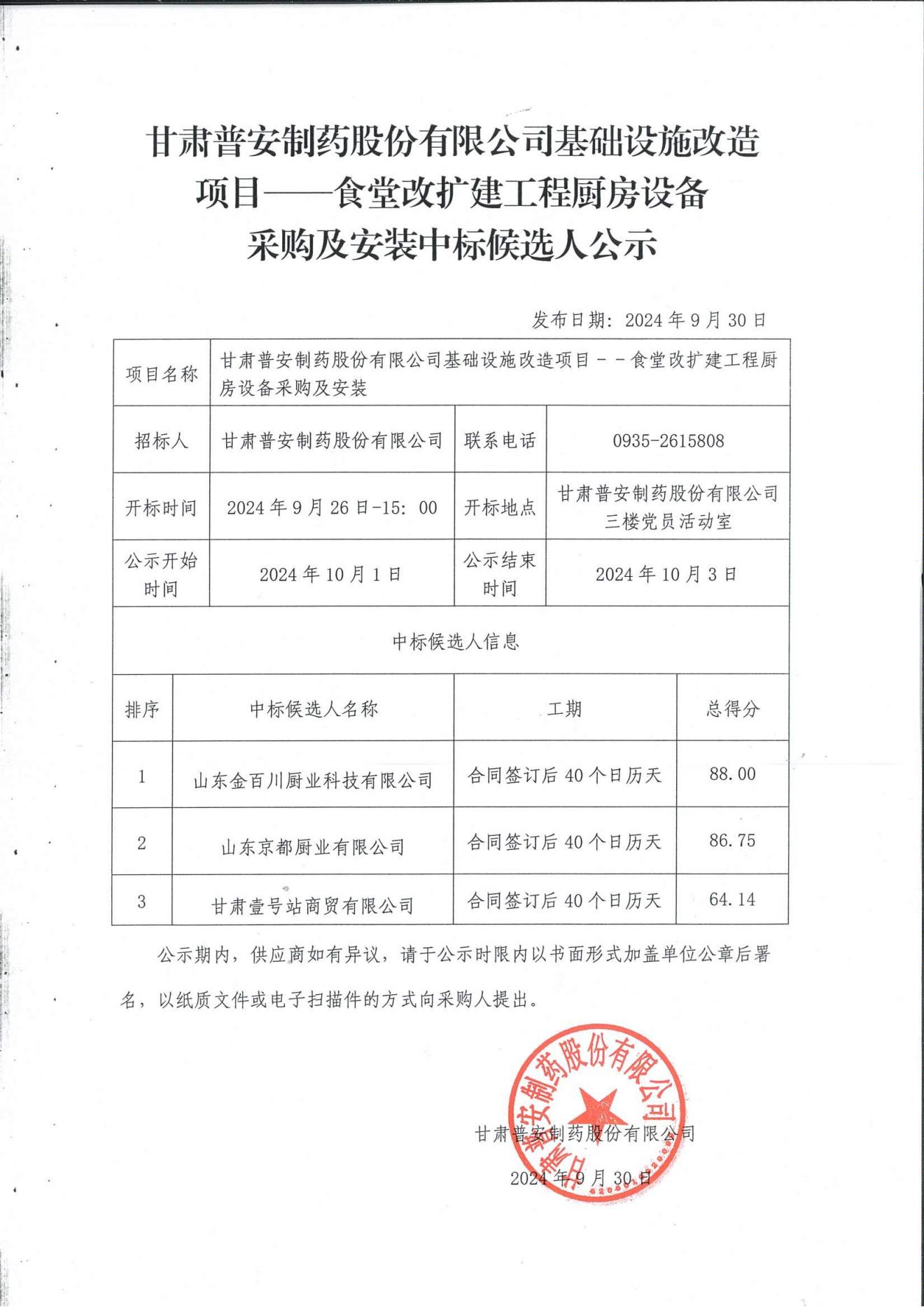 甘肅普安制藥股份有限公司基礎(chǔ)設(shè)施改造項(xiàng)目--食堂改擴(kuò)建工程廚房設(shè)備采購及安裝中標(biāo)候選人公示