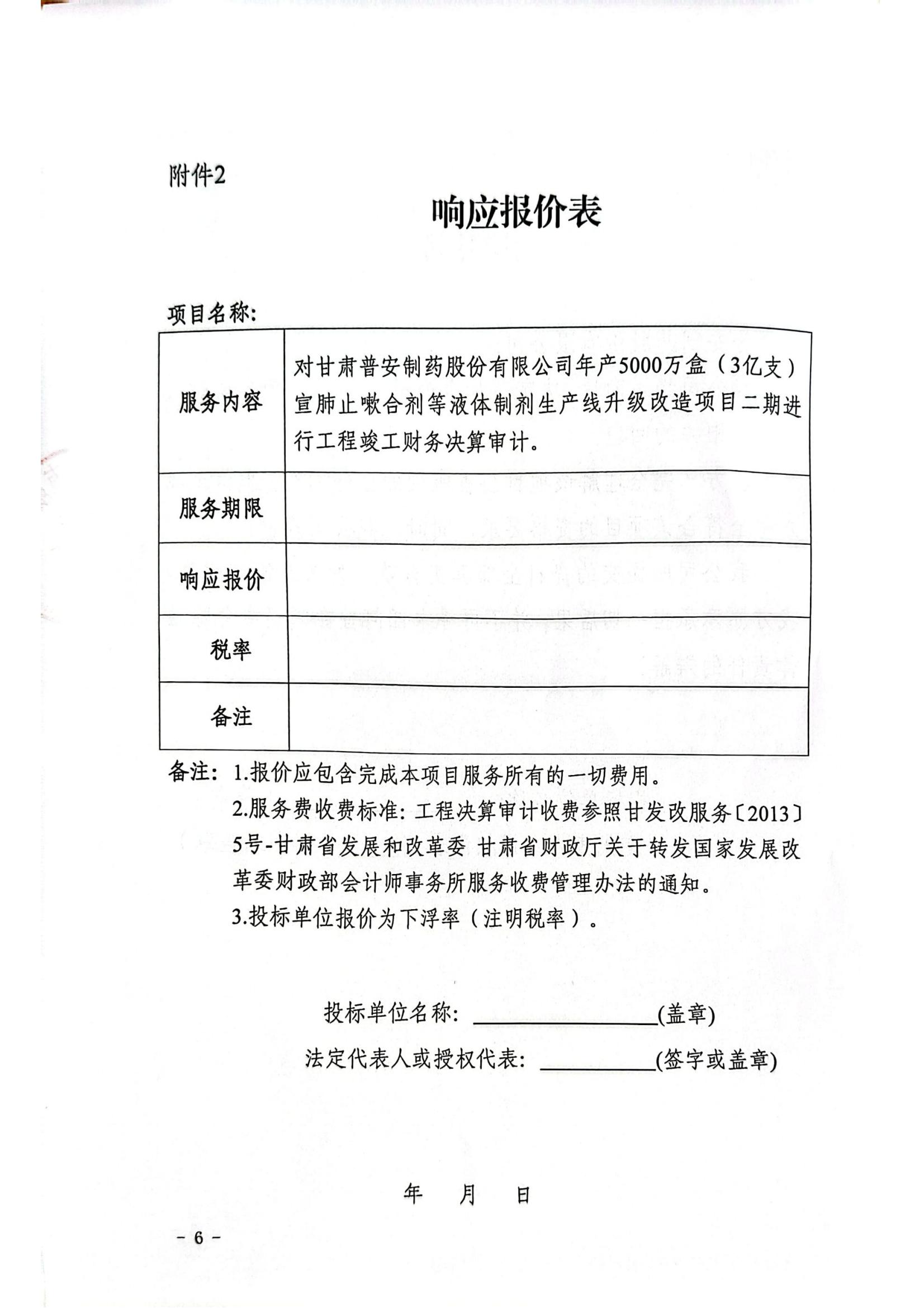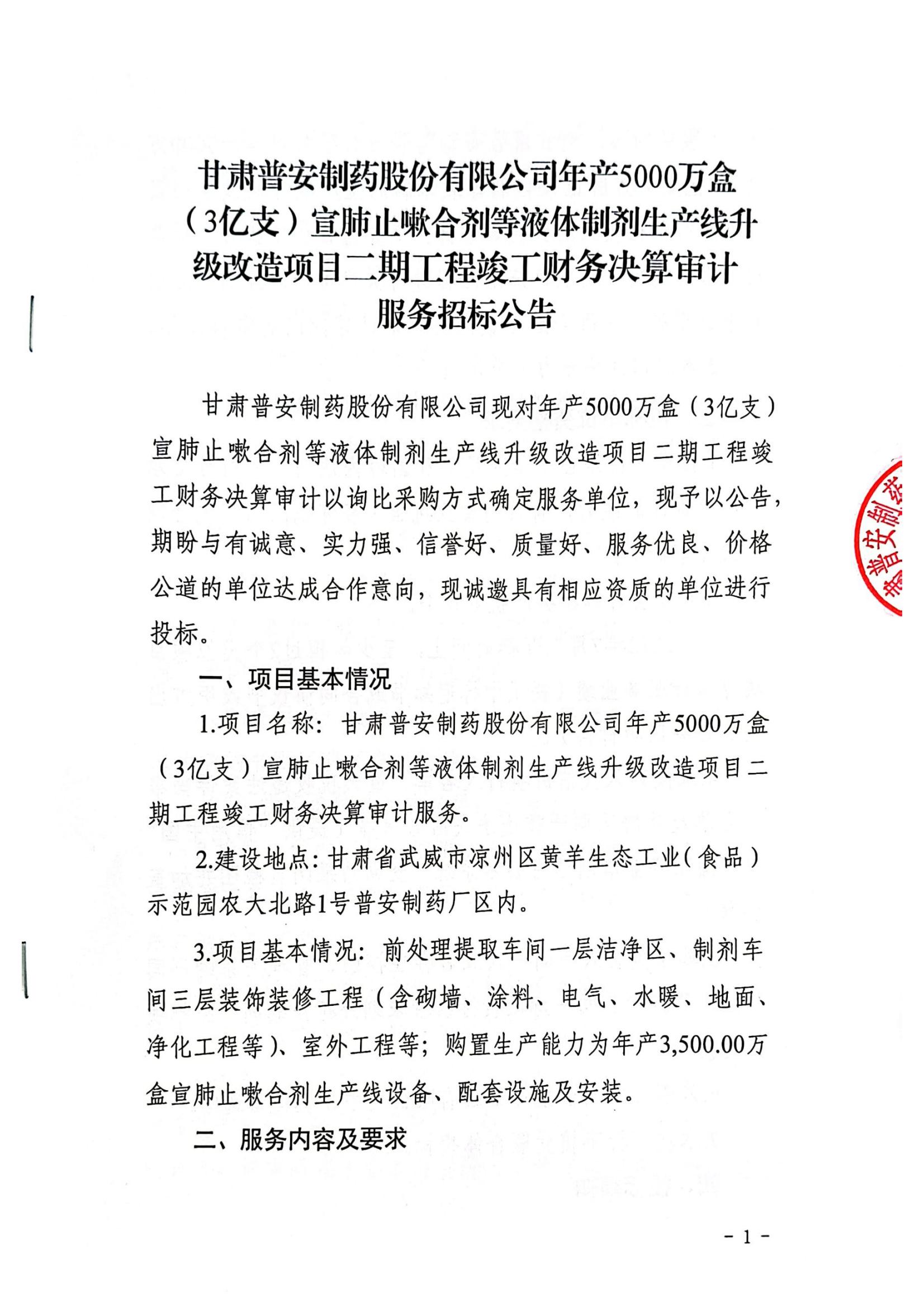 甘肅普安制藥股份有限公司年產(chǎn)5000萬(wàn)盒宣肺止嗽合劑等液體制劑生產(chǎn)線升級(jí)改造項(xiàng)目二期竣工決算審計(jì)服務(wù)招標(biāo)公告
