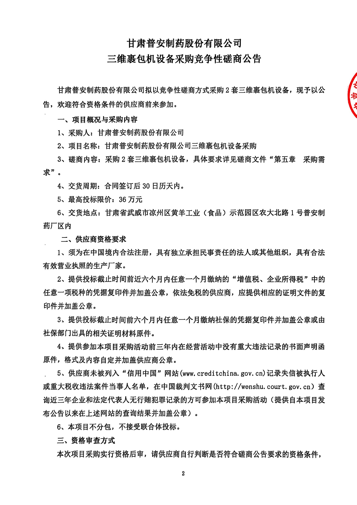 甘肅普安制藥股份有限公司三維裹包機(jī)設(shè)備采購競爭性磋商公告
